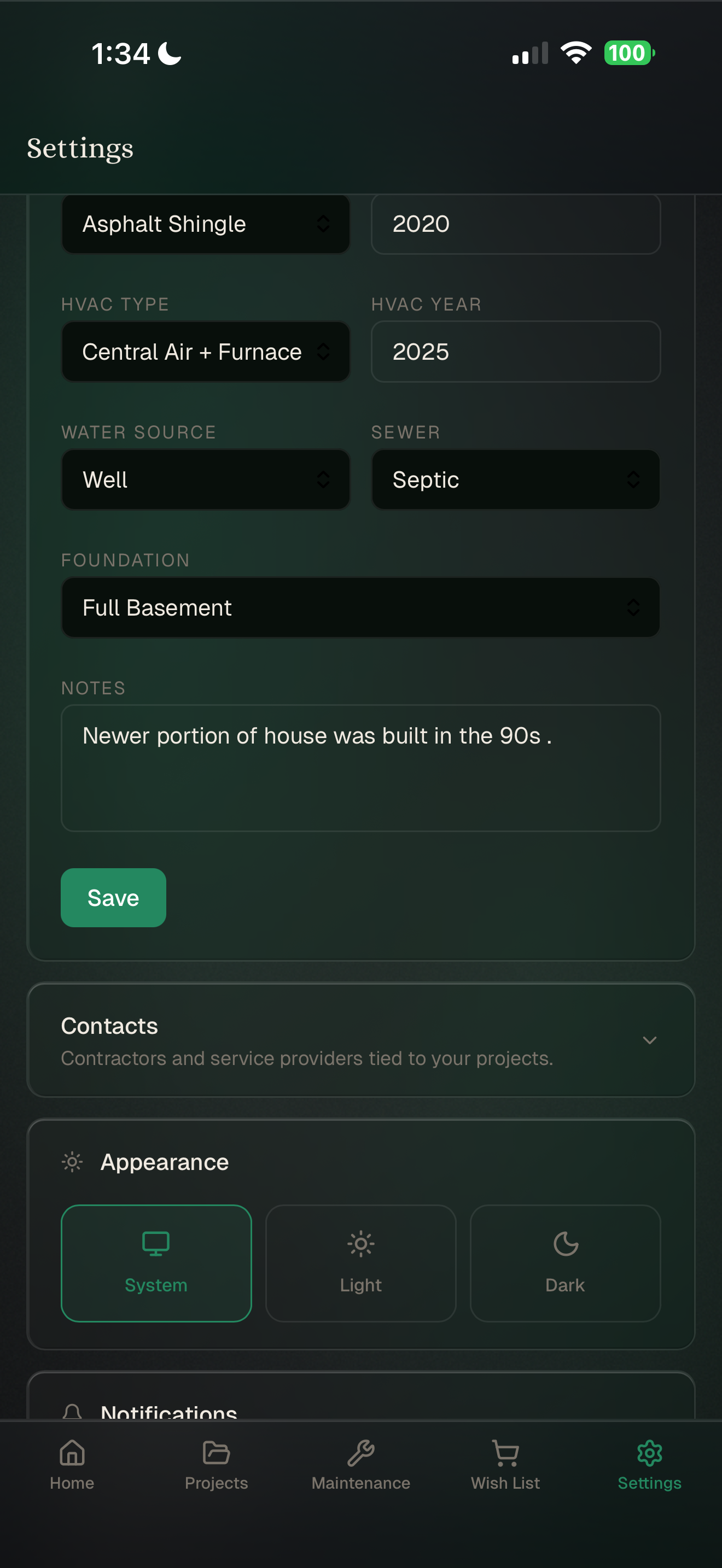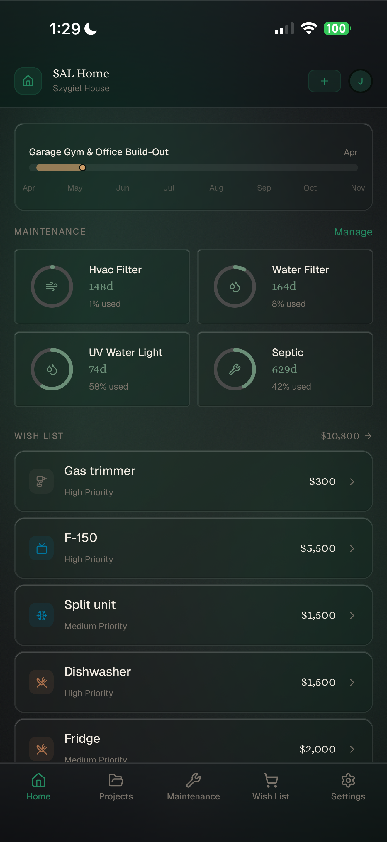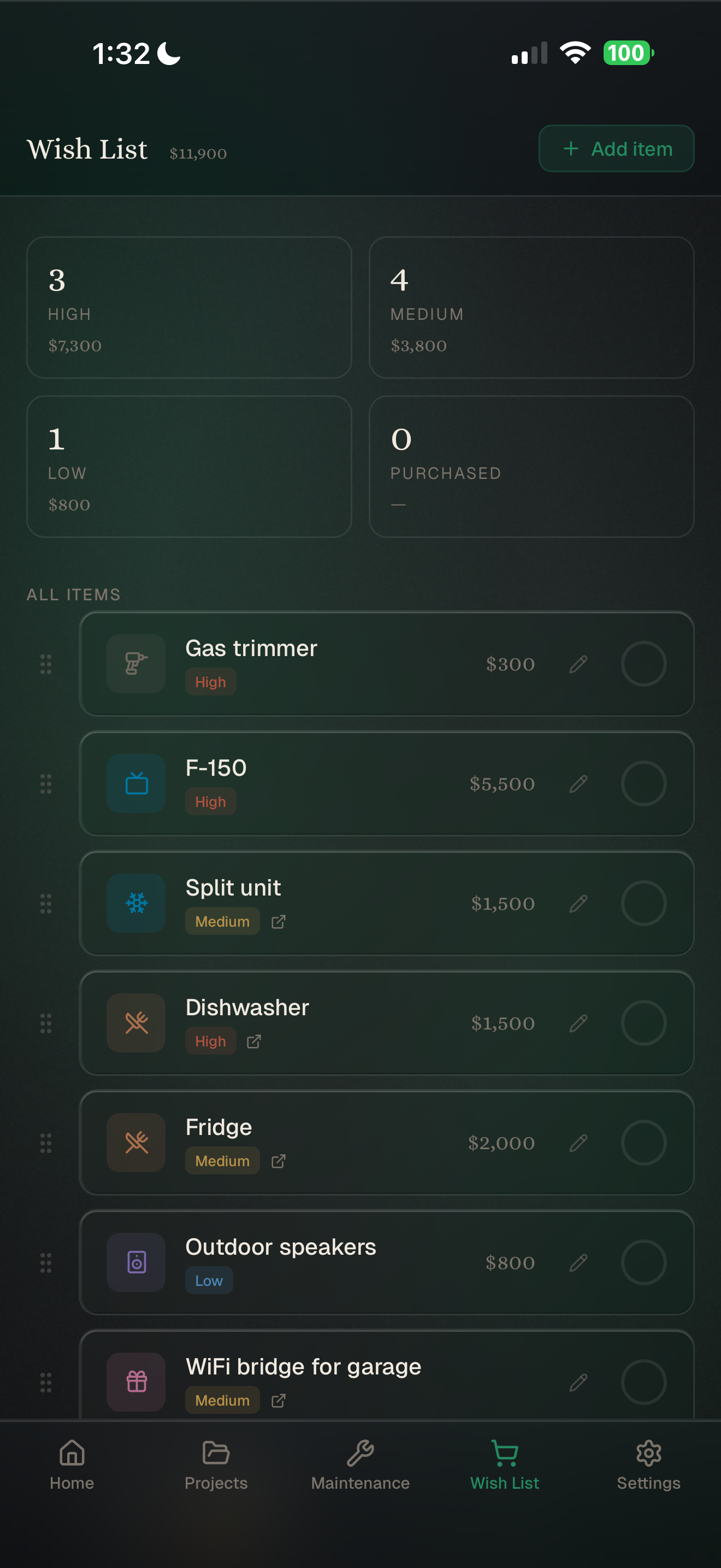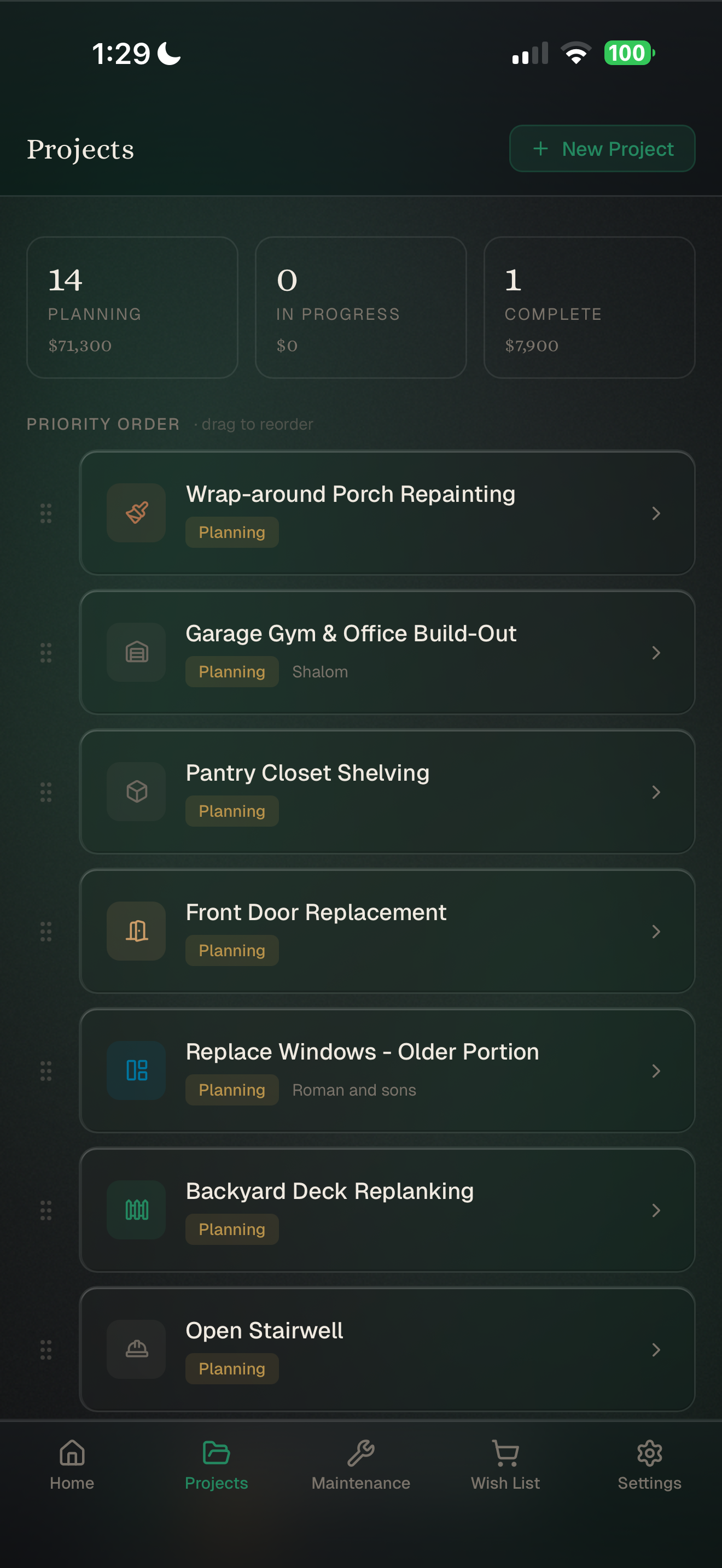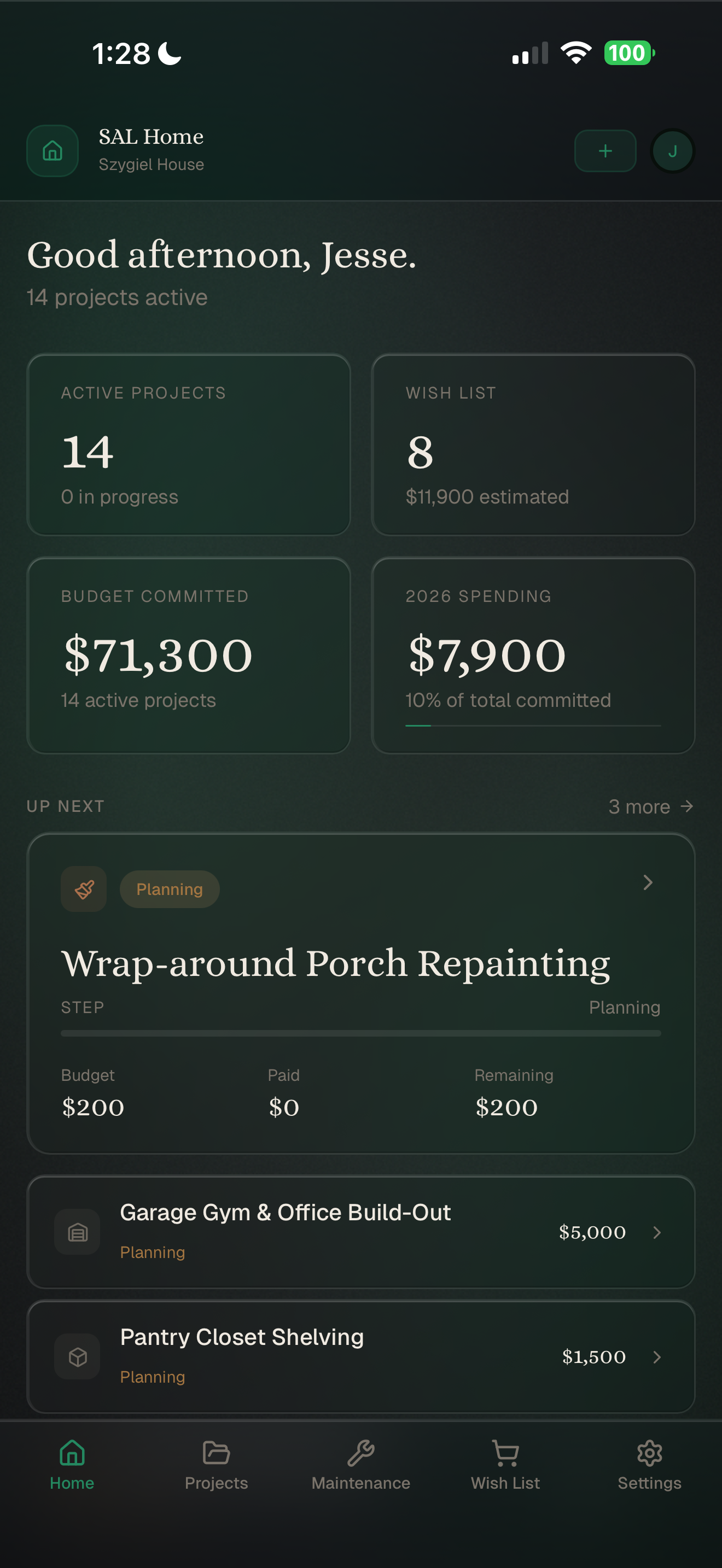 A home management PWA built in a single evening — no Figma, no desk, mostly from my phone. My wife and I own a 150-year-old farmhouse and keeping track of projects, contractors, and maintenance was a mess. So I built something. It was live the next morning.